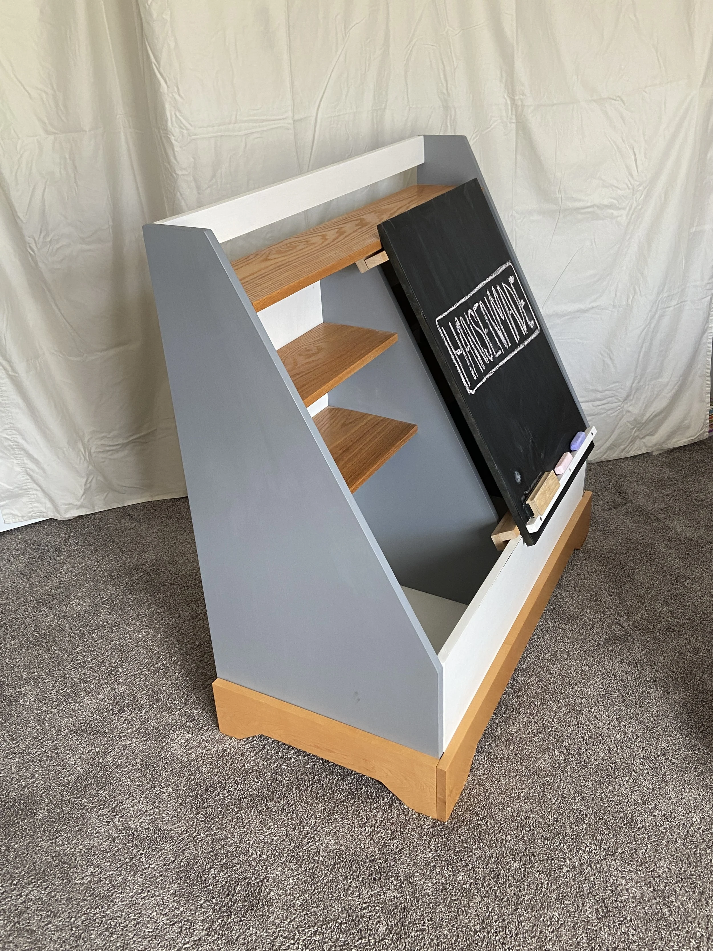 Such an amazing versatile piece for your child's bedroom or playroom. Three shelves for books, pictures or other mementos. Bottom storage area for toys or stuffed animals and a sliding chalkboard that can also be used as an easel! I made this for my daughter and couldn't be more thrilled how it came out. I'm happy to customize the colors, so just let me know what you'd like.